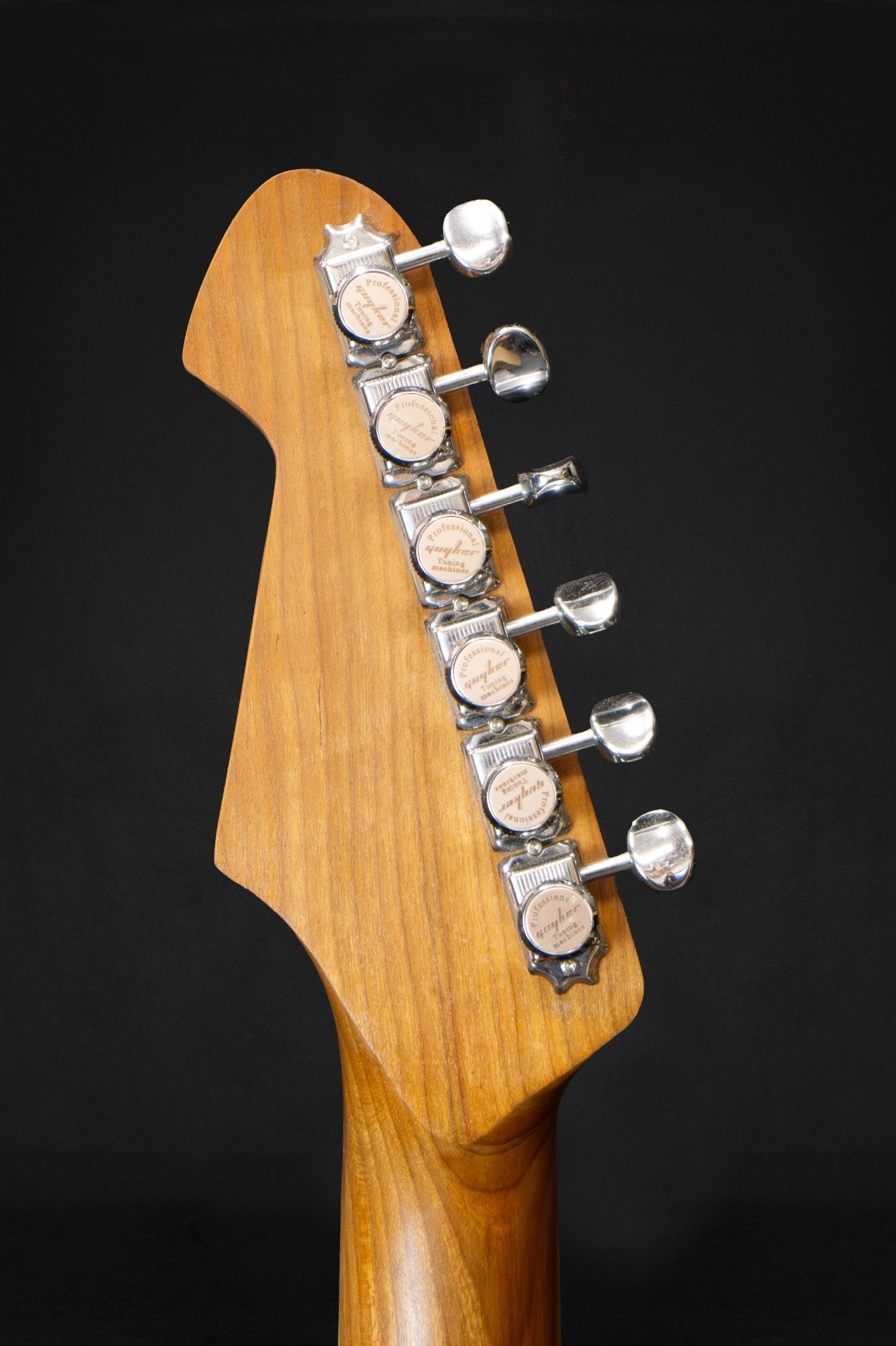 Electronics are powered by a Zona 23 neck pickup (outer coil: Alnico 2, inner: Alnico 3) and Zona 35 bridge pickup (inner: Alnico 3, outer: Alnico 5), offering rich tonal versatility. The circuit includes 1 volume, 1 tone (250k) with an Orange Drop cap, a 3-way toggle, and Zona’s Simplified Switching Circuit via a discreet micro switch, all wired with a vintage loom and Switchcraft socket. Finished with a Zona aluminium neck plate and vintage NOS stereo-style knobs, this guitar is as bold in tone as it is in design—made for players who want something truly unique.
